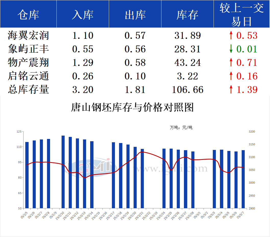 截至今晨,唐山地区样本仓库钢坯库存总量约106.66万吨,单日入库总量3.2万吨,出库总量1.81万吨。