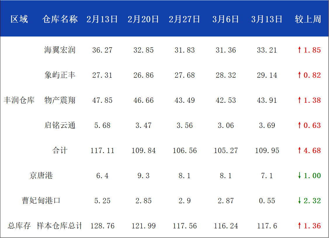 本周钢坯社会库存117.6万吨,较上期增库1.36万吨。唐山丰润仓库钢坯总库存量109.95万吨,较上期增库4.68万吨。京唐港总库存7.1万吨,较上期降库1万吨;曹妃甸港口库存总量0.05万吨,较上期降库2.32万吨。