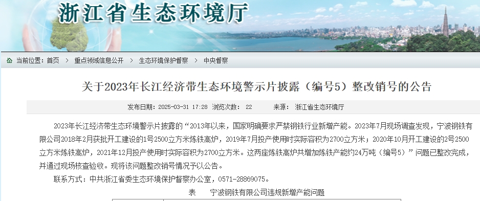 2023年长江经济带生态环境警示片披露的“2013年以来,国家明确要求严禁钢铁行业新增产能。2023年7月现场调查发现,宁波钢铁有限公司2018年2月获批开工建设的1号2500立方米炼铁高炉,2019年7月投产使用时实际容积为2700立方米;2020年10月开工建设的2号2500立方米炼铁高炉,2021年12月投产使用时实际容积为2700立方米。这两座炼铁高炉共增加炼铁产能约24万吨(编号5)”问题已整改完成,并通过现场核查验收。现将该问题整改销号情况予以公告。