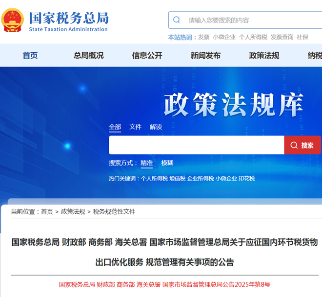 近日,国家税务总局、财政部、商务部、海关总署以及国家市场监督管理总局五大部门联合发布了《关于应征国内环节税货物出口优化服务 规范管理有关事项的公告》。