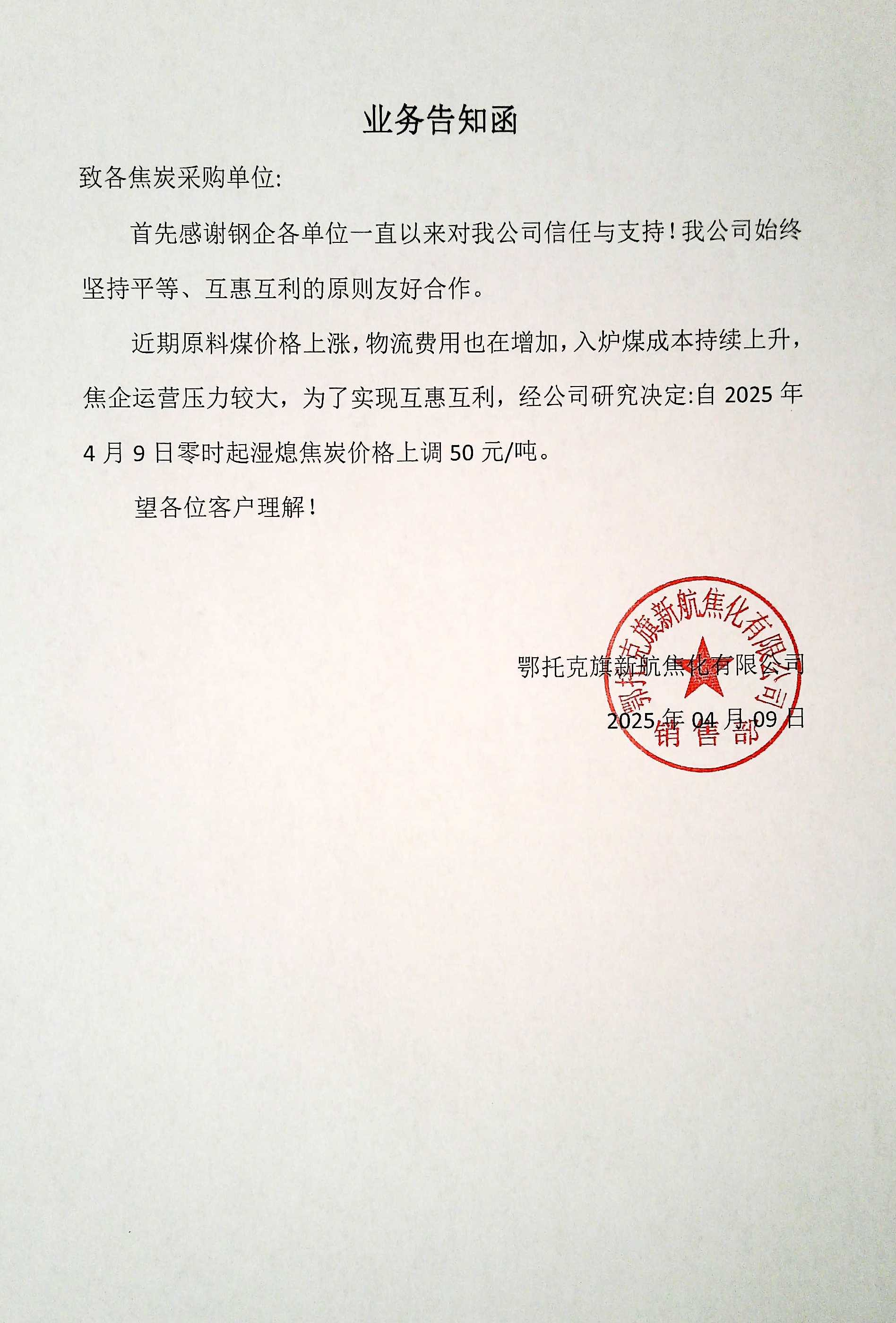 近期原料煤价格上涨,物流费用也在增加,入炉煤成本持续上升焦企运营压力较大,为了实现互惠互利,经公司研究决定:自2025年4月9日零时起湿熄焦炭价格上调50元/吨。