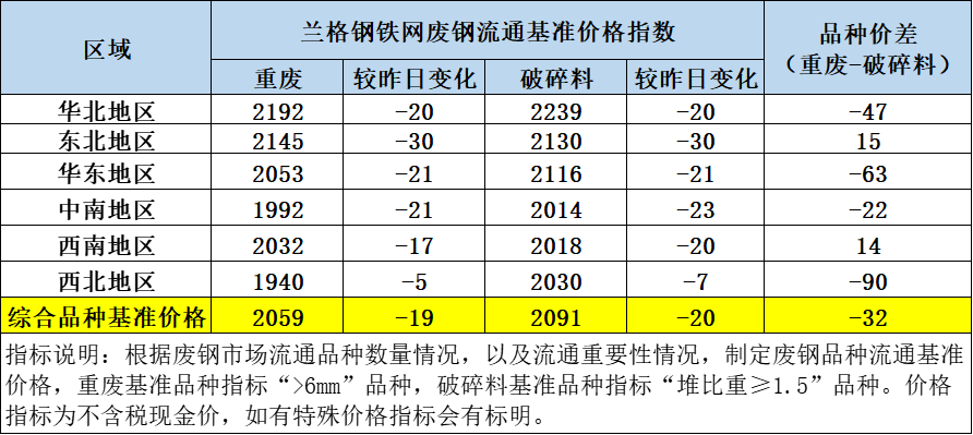 4月9日兰格钢铁网废钢流通基准价格指数为2075跌20