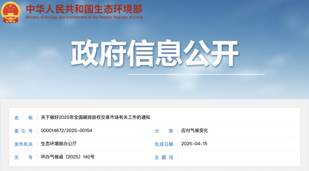 4月15日,生态环境部发布《关于做好2025年全国碳排放权交易市场有关工作的通知》。