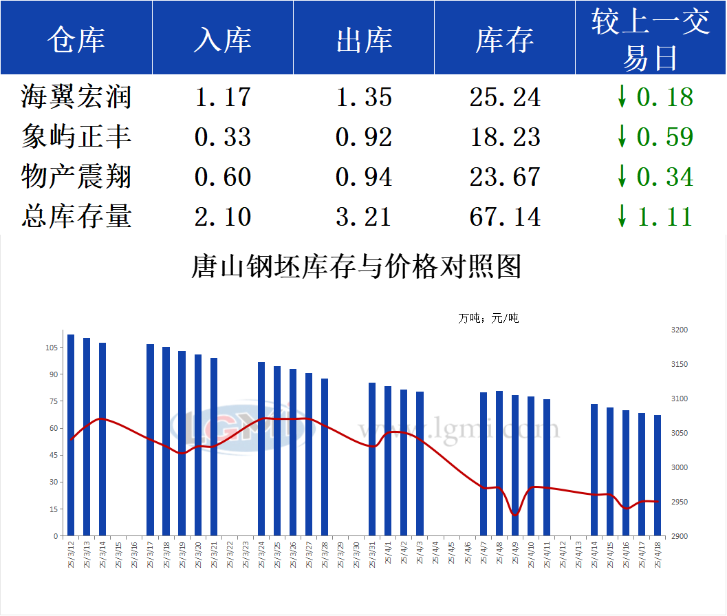 截至今晨,唐山地区样本仓库钢坯库存总量约67.14万吨,单日入库总量2.1万吨,出库总量3.21万吨。