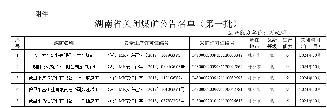 攸县大兴矿业有限公司大兴煤矿等5处2024年度关闭退出煤矿已通过省级验收,按照钢铁煤炭行业化解过剩产能和脱困发展工作部际联席会议办公室《关于做好钢铁煤炭去产能公示公告工作的通知》规定,现予以公告。