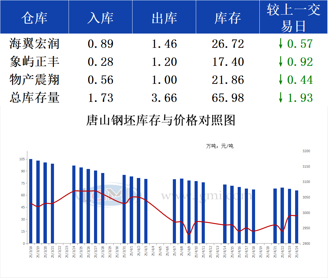 截至今晨,唐山地区样本仓库钢坯库存总量约65.98万吨,单日入库总量1.73万吨,出库总量3.66万吨。
