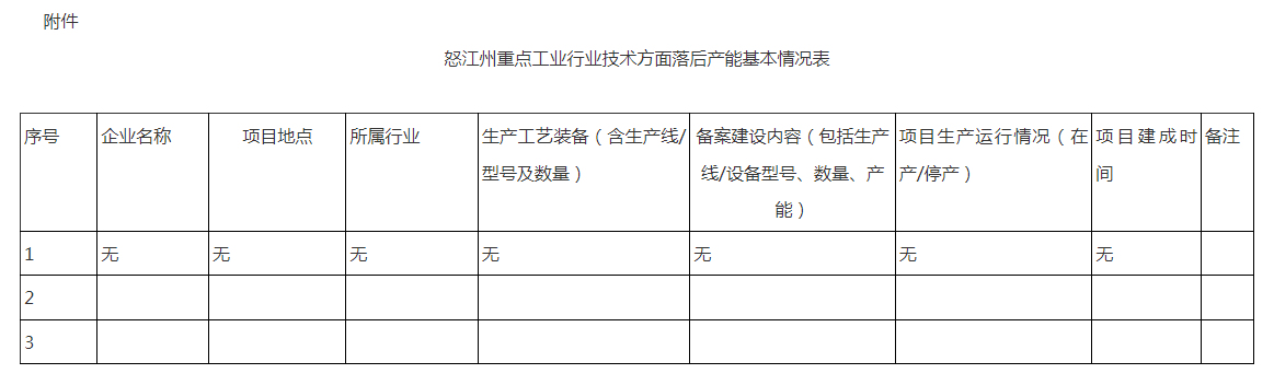 为坚决出清技术方面落后产能,按照《云南省工业和信息化厅关于做好2025年重点工业行业技术方面落后产能摸底排查工作的函》(产业〔2025〕39号)要求,怒江州人民政府组织四县(市)以钢铁(炼钢、炼铁、铁合金)、建材(水泥熟料、平板玻璃、粉磨、石灰窑)、石化化工(焦炭、电石、黄磷、烧碱)、有色金属(电解铝、铜铅锌锡冶炼)、造纸、纺织等行业为重点,依据《产业结构调整指导目录(2024年本)》对辖区内技术方面落后产能进行全面摸底排查。根据四县(市)人民政府上报的摸底排查相关书面材料,怒江州钢铁(炼钢、炼铁、铁合金)、建材(水泥熟料、平板玻璃、粉磨、石灰窑)、石化化工(焦炭、电石、黄磷、烧碱)、有色金属(电解铝、铜铅锌锡冶炼)、造纸、纺织等重点工业行业技术方面落后产能已全部退出。