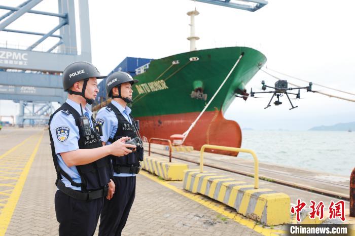 图为惠州边检站民警使用无人机对货轮进行监护。练柯柯 摄
