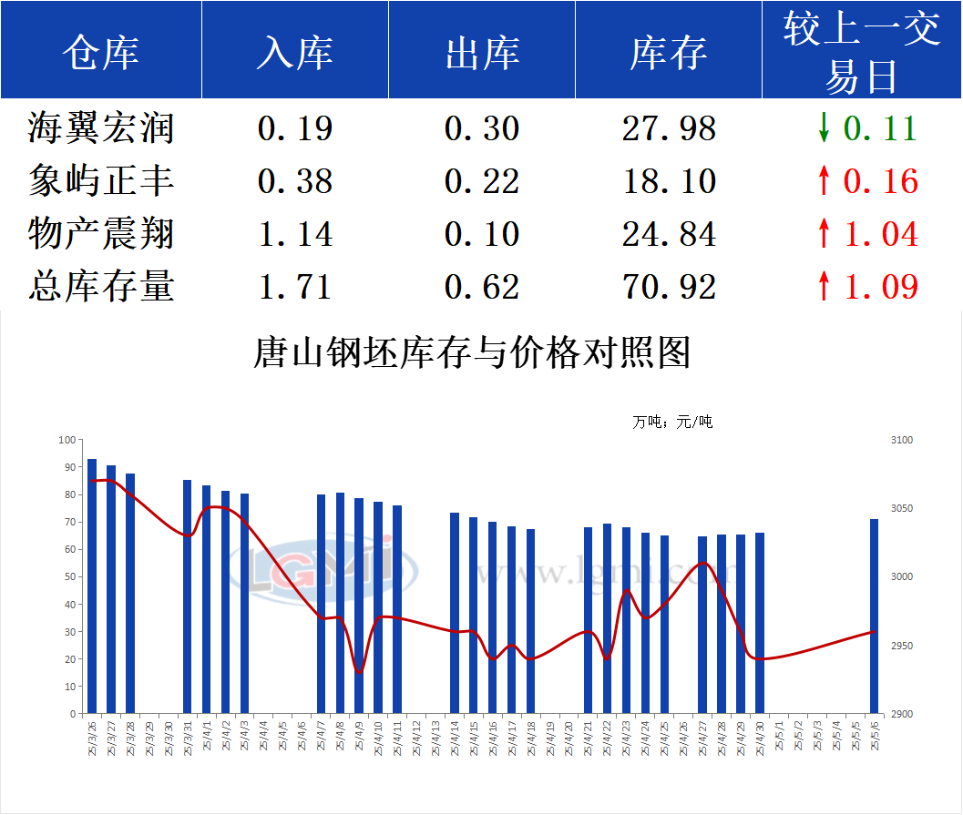 截至今晨,唐山地区样本仓库钢坯库存总量约70.92万吨,单日入库总量1.71万吨,出库总量0.62万吨。