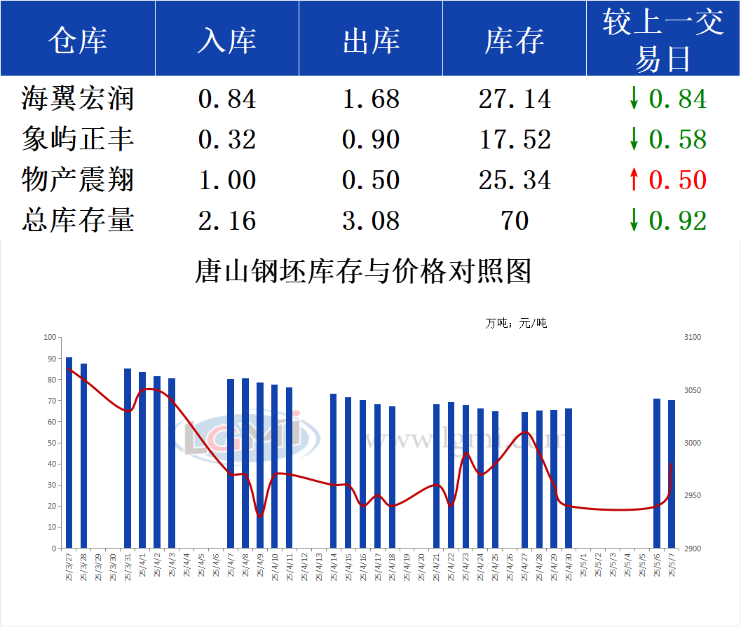 截至今晨,唐山地区样本仓库钢坯库存总量约70万吨,单日入库总量2.16万吨,出库总量3.08万吨。
