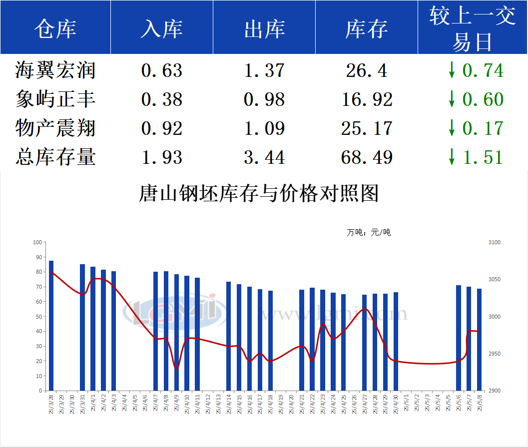 截至今晨,唐山地区样本仓库钢坯库存总量约68.49万吨,单日入库总量1.93万吨,出库总量3.44万吨。