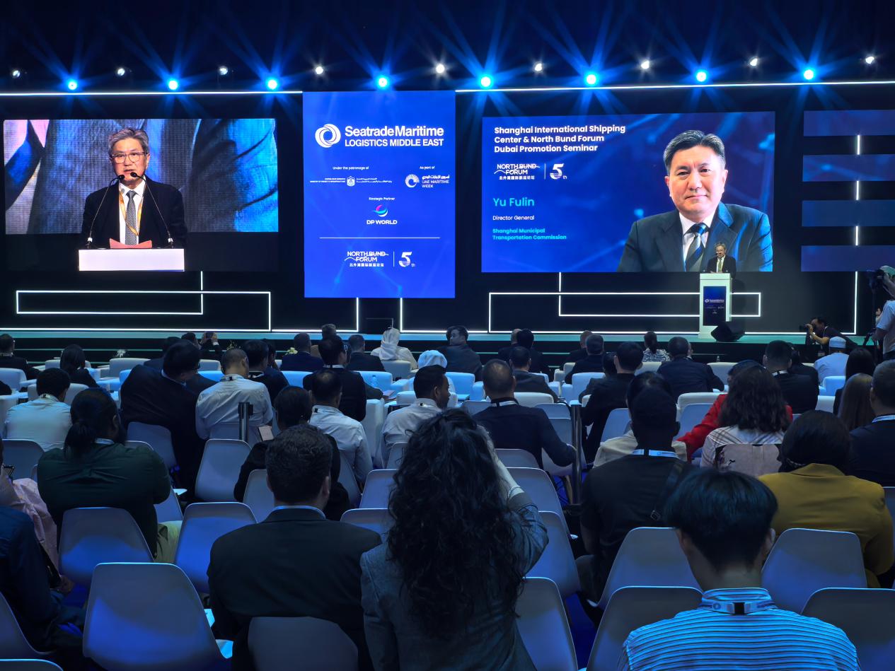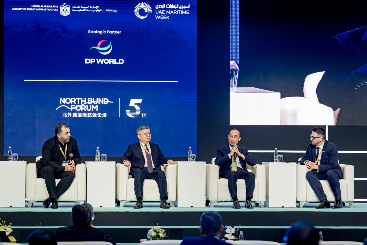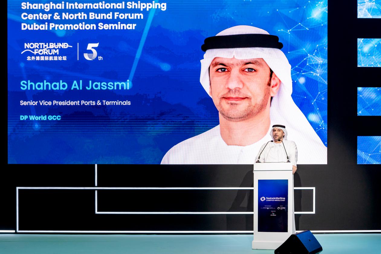 张益明在致辞中表示,中阿两国是全面战略合作伙伴。作为全球贸易的两大枢纽,中国与阿联酋的合作始终以“互联互通”为核心。在“一带一路”倡议框架下,两国在航运、港口、物流、船舶等领域的合作成果丰硕。2024年,中阿双边贸易额突破1000亿美元,其中超90%的货物通过海运完成,中国到海湾国家商品,60%以上通过阿联酋港口中转,这正是双方合作成果的最佳证明。如今推介北外滩国际航运论坛,更希望搭建一座政策对接、经贸合作、技术交流、人员往来的桥梁。