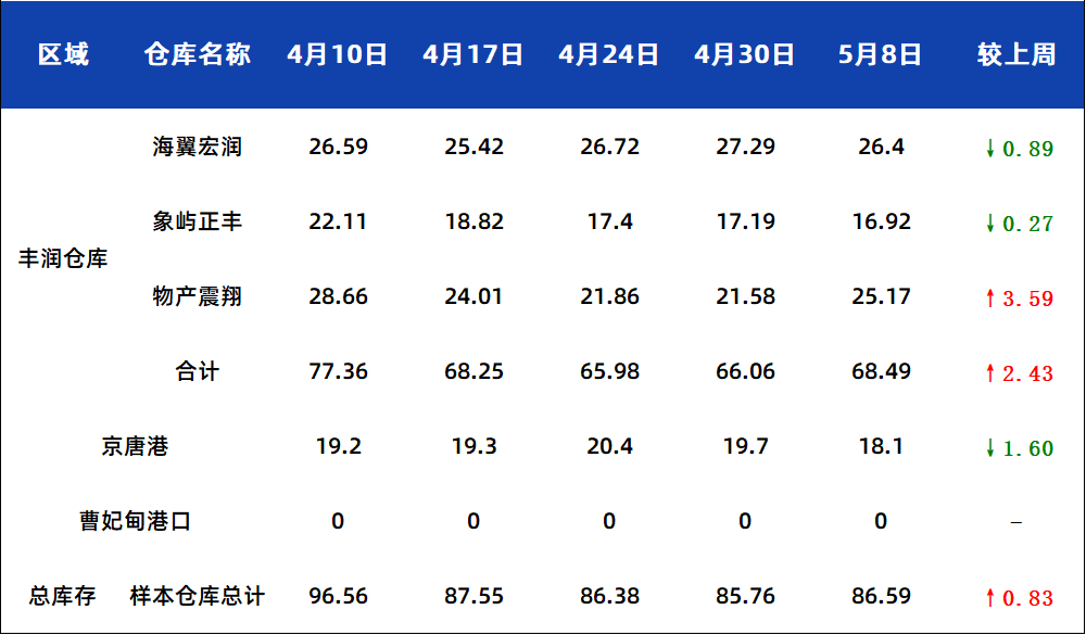 本周钢坯社会库存86.59万吨,较上期增库0.83万吨。唐山丰润仓库钢坯总库存量68.49万吨,较上期增库2.43万吨。京唐港总库存18.1万吨,较上期降库1.6万吨。