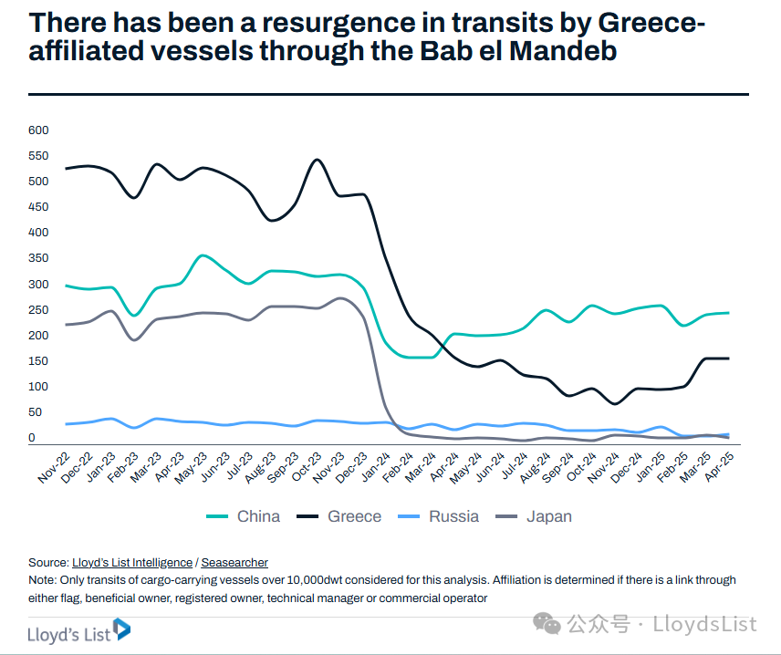 例如,与希腊有关联的船舶先前因遭遇连续的胡塞袭击而活跃度大减,但过去几个月的通行量已有所恢复。