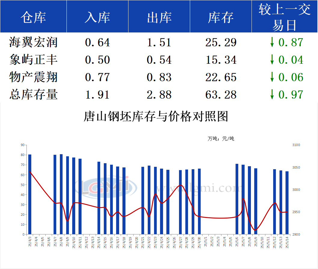 截至今晨,唐山地区样本仓库钢坯库存总量约63.28万吨,单日入库总量1.91万吨,出库总量2.88万吨。