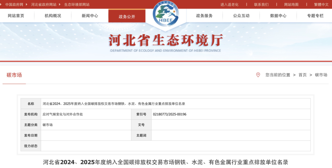 近日,河北省生态环境厅网站发布了《河北省2024、2025年度纳入全国碳排放权交易市场钢铁、水泥、有色金属行业重点排放单位名录》。