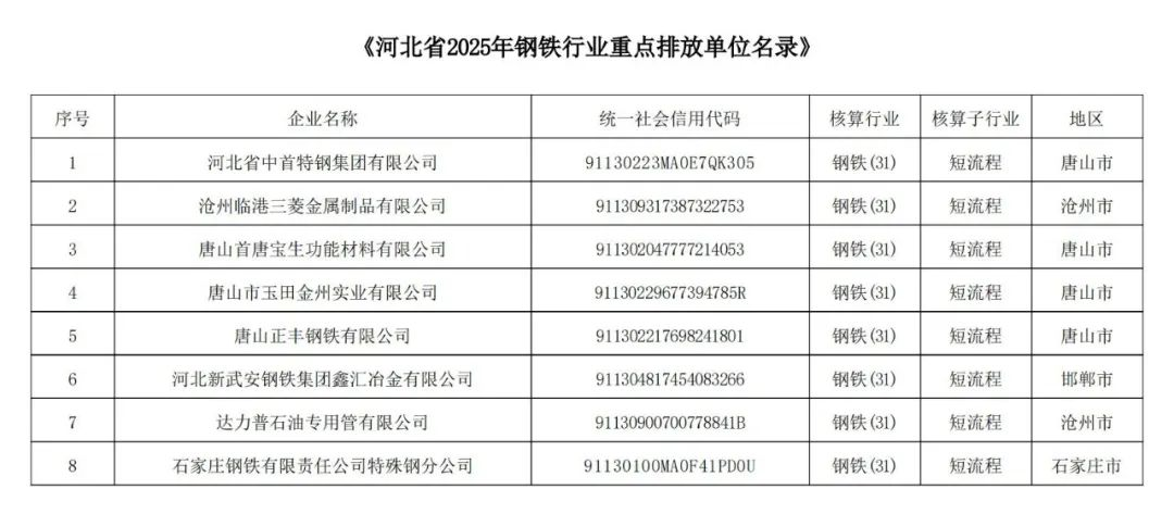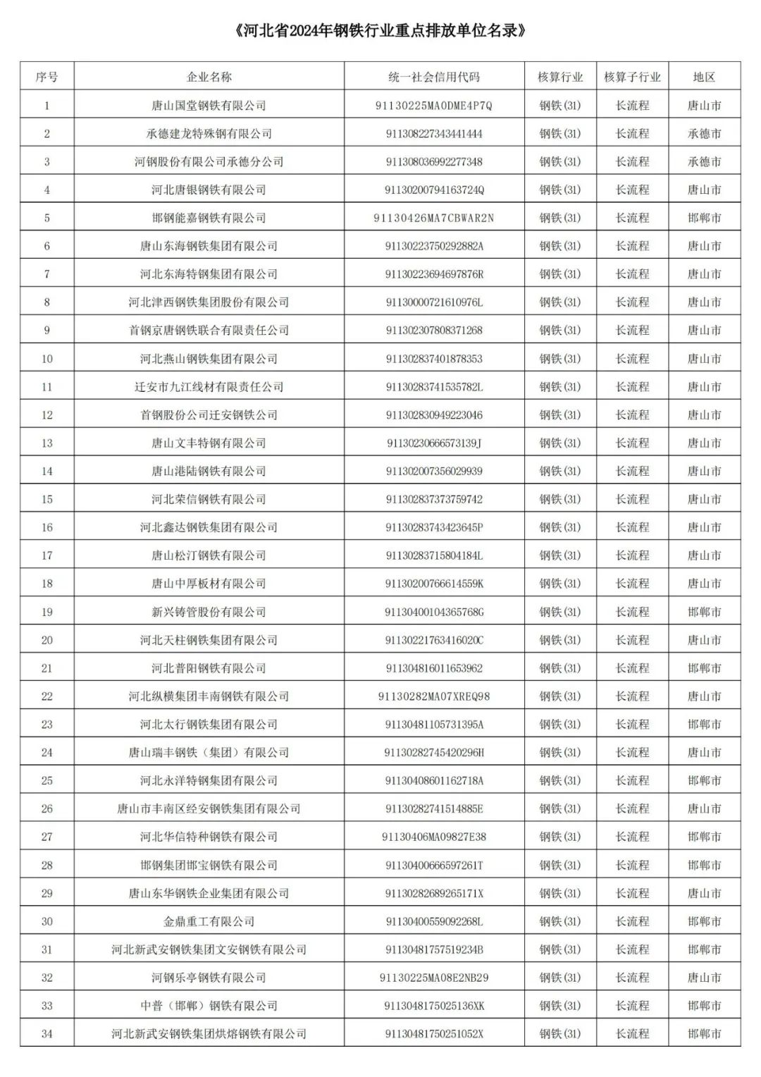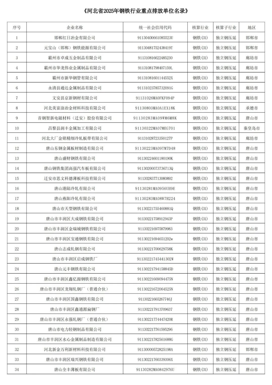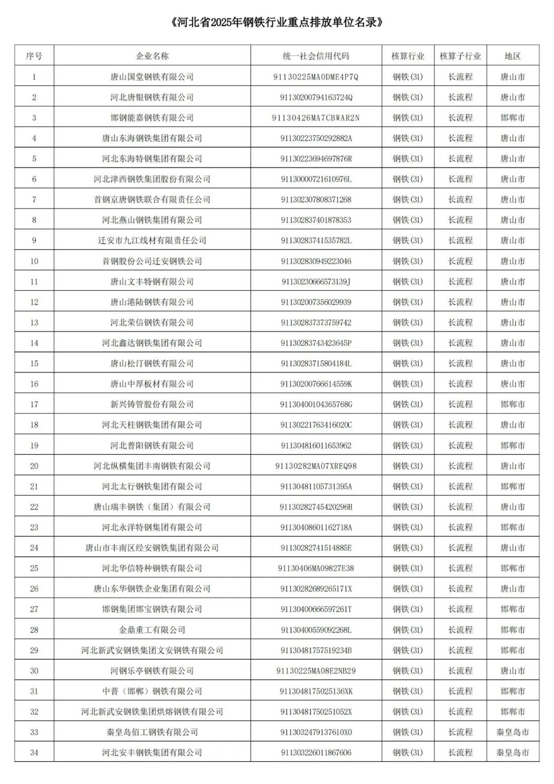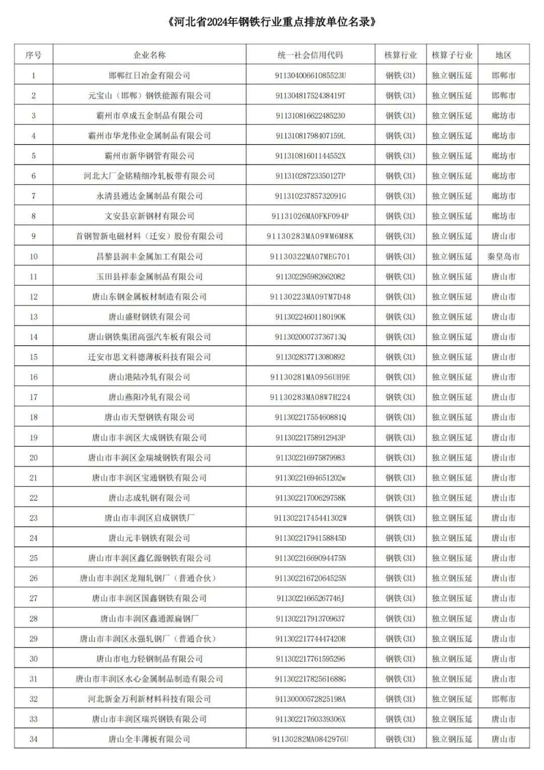 根据《碳排放权交易管理暂行条例》《生态环境部办公厅关于做好2025年全国碳排放权交易市场有关工作的通知》(环办气候函〔2025〕140号)有关规定,现将河北省2024、2025年度纳入全国碳排放权交易市场钢铁、水泥、有色金属行业重点排放单位名录公布如下。