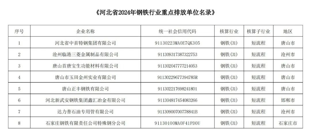 河北省2024、2025年度纳入全国碳排放权交易市场钢铁行业重点排放单位名录