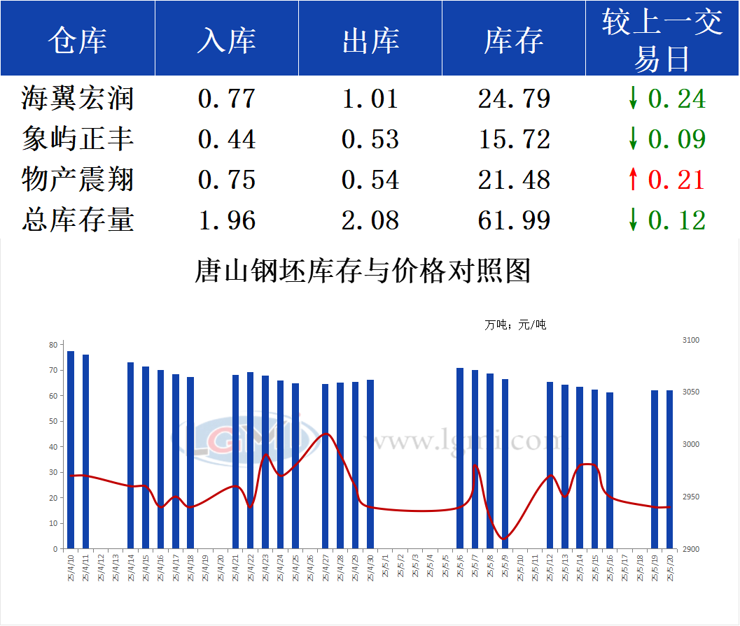 截至今晨,唐山地区样本仓库钢坯库存总量约61.99万吨,单日入库总量1.96万吨,出库总量2.08万吨。