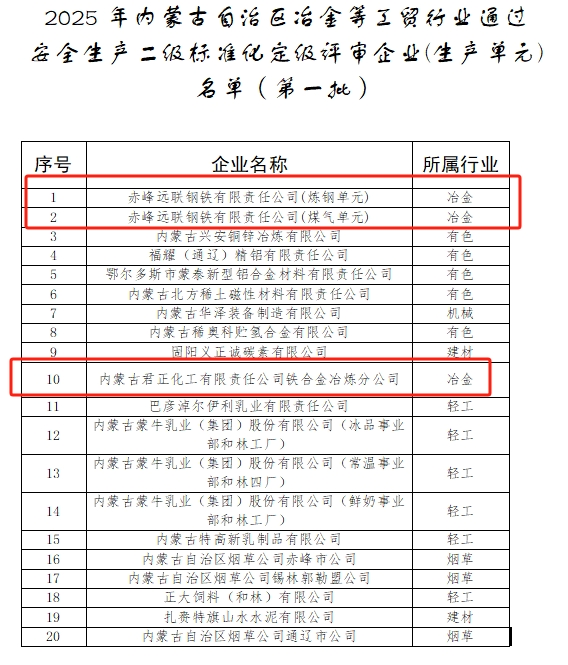 2025年内蒙古冶金等工贸行业安全生产二级标准化定级企业(第一批)公示
