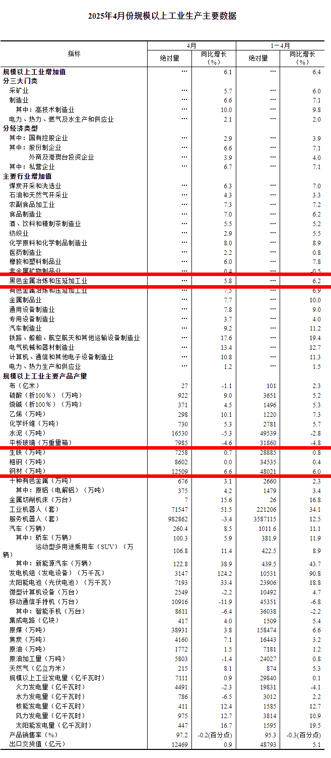 文内数据显示:4月份,中国生铁产量7258万吨,同比增长0.7%;粗钢产量8602万吨,同比持平;钢材产量12509万吨,同比增长6.6%。