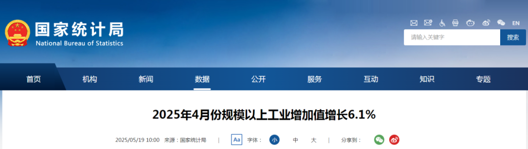 5月19日,国家统计局发布了文章,公布了2025年4月份规模以上工业生产主要数据。