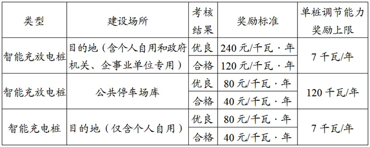 (二)V2G调节能力年度奖励。对智能充(放)电桩V2G,根据电网企业调节能力考核结果(考核规则另行发布)给予奖励,奖励期3年。个人自用非智能充电桩2024年底前完成智能充电桩替代的,可获得智能充电桩奖励;2025年及以后完成智能充电桩替代的,不再奖励。具体标准详见下表。