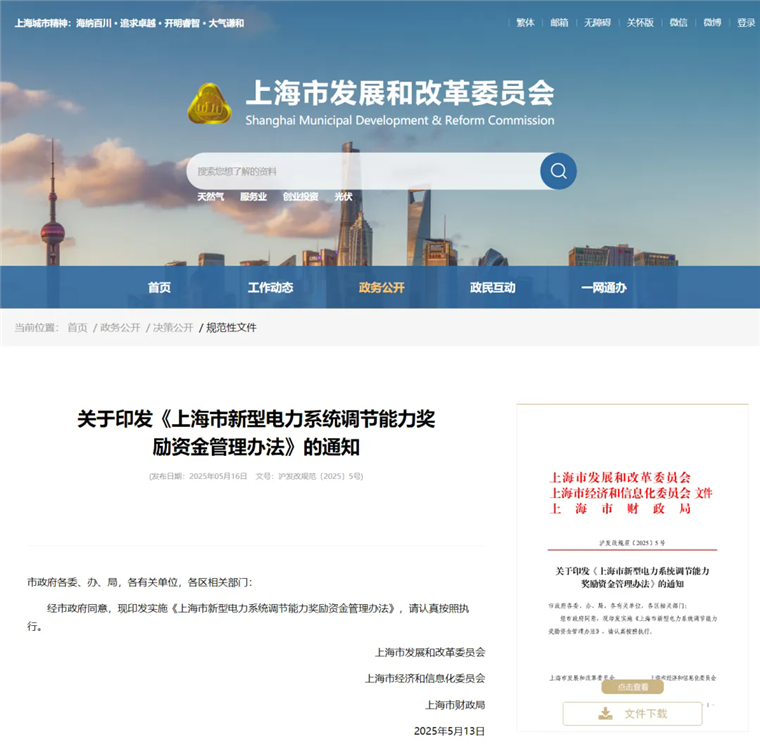 据全球液流电池网获悉,5月19日,上海市发展和改革委员会印发《上海市新型电力系统调节能力奖励资金管理办法》。