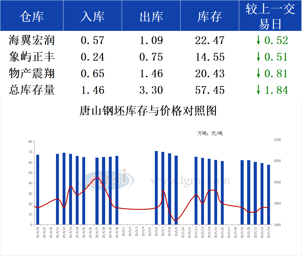 截至今晨,唐山地区样本仓库钢坯库存总量约57.45万吨,单日入库总量1.46万吨,出库总量3.30万吨。