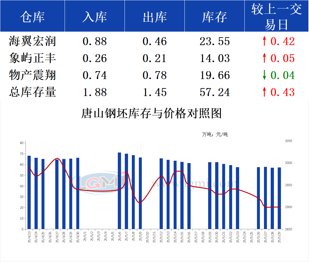 截至今晨,唐山地区样本仓库钢坯库存总量约57.24万吨,单日入库总量1.88万吨,出库总量1.45万吨。