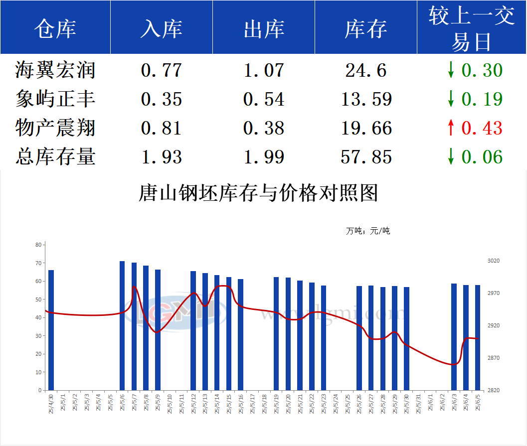 截至今晨,唐山地区样本仓库钢坯库存总量约57.85万吨,单日入库总量1.93万吨,出库总量1.99万吨。