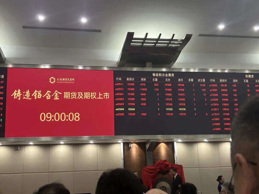 铸造铝合金锭上市首日,盘中高开,铝合金期货2511主力合约高开19400,涨1035,涨幅为5.64%。