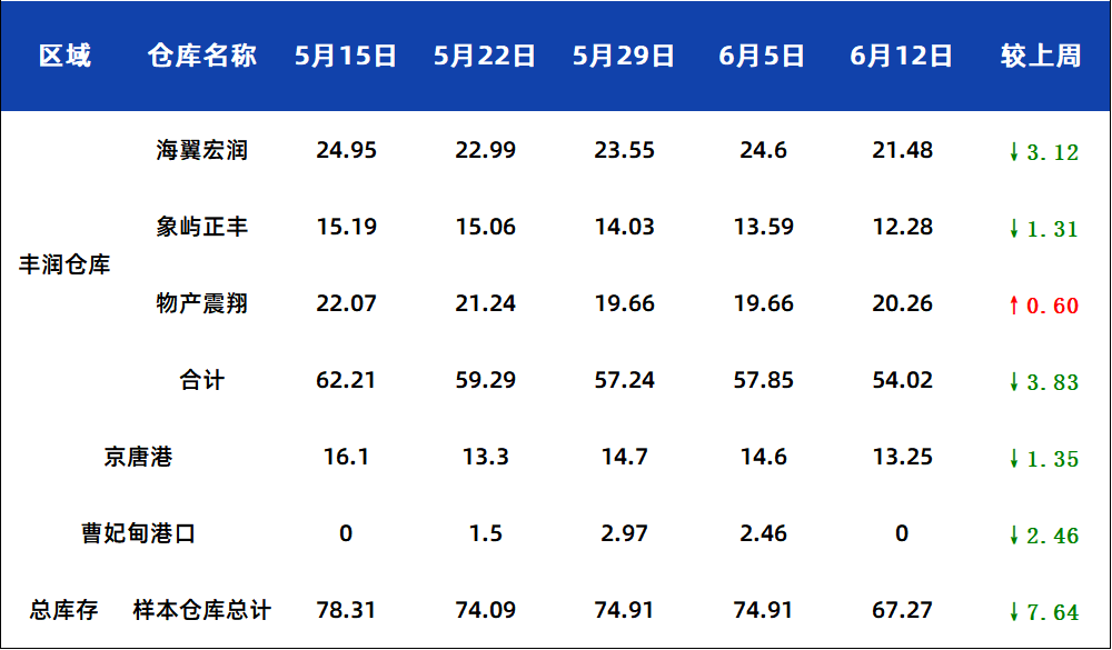 本周钢坯社会库存67.27万吨,较上期降7.64万吨。唐山丰润仓库钢坯总库存量54.02万吨,较上期降库3.83万吨。京唐港总库存13.25万吨,较上期降库1.35万吨。曹妃甸港口库存总量0万吨,较上期降库2.46万吨。