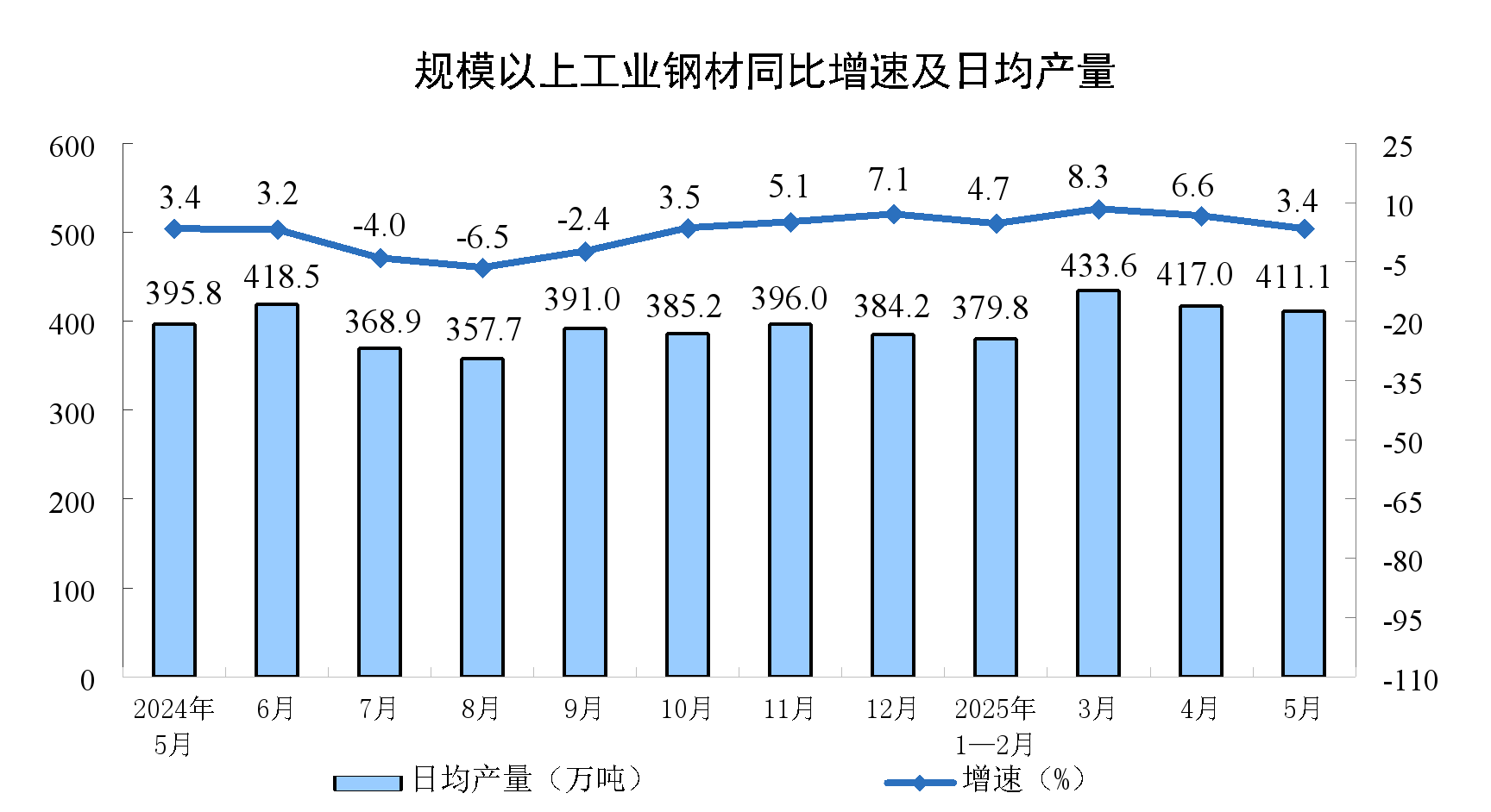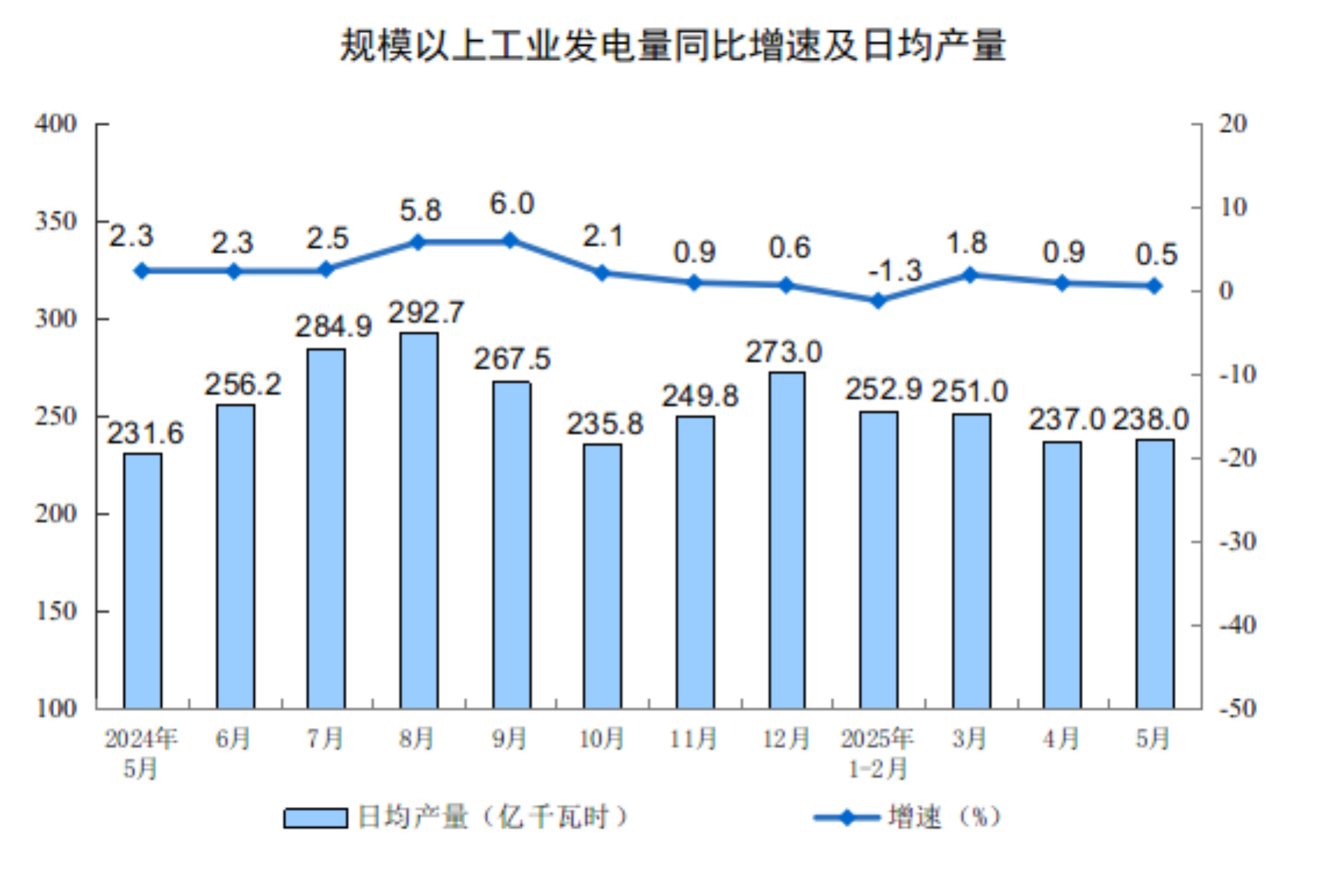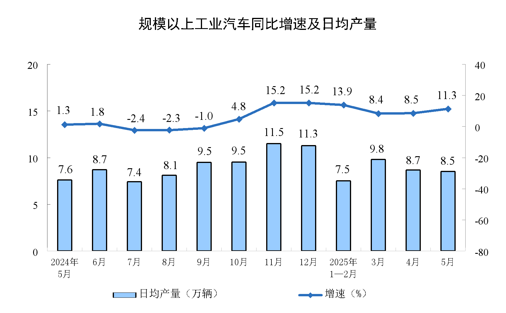 分产品看,5月份,规模以上工业623种产品中有326种产品产量同比增长。其中,钢材12743万吨,同比增长3.4%;水泥16500万吨,下降8.1%;十种有色金属683万吨,增长2.9%;乙烯303万吨,增长14.4%;汽车264.2万辆,增长11.3%,其中新能源汽车124.5万辆,增长31.7%;发电量7378亿千瓦时,增长0.5%;原油加工量5911万吨,下降1.8%。