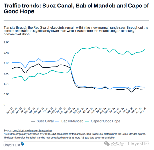 这些通航量处于“新常态”范围,比胡塞武装袭击前的水平低60%。