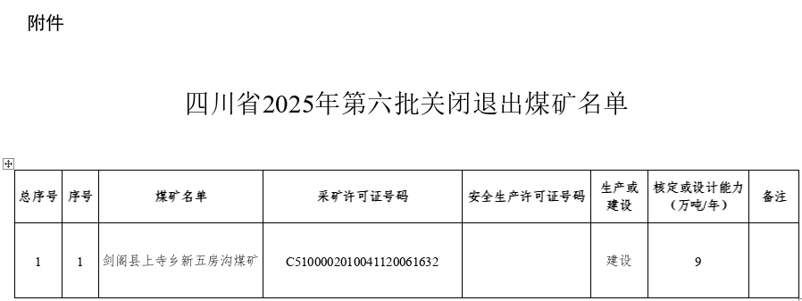 经煤矿企业申请和相关县级人民政府研究决定,相关市安全生产委员会办公室申报,确定全省2025年第六批关闭退出煤矿名单,现予以公示,接受社会监督。