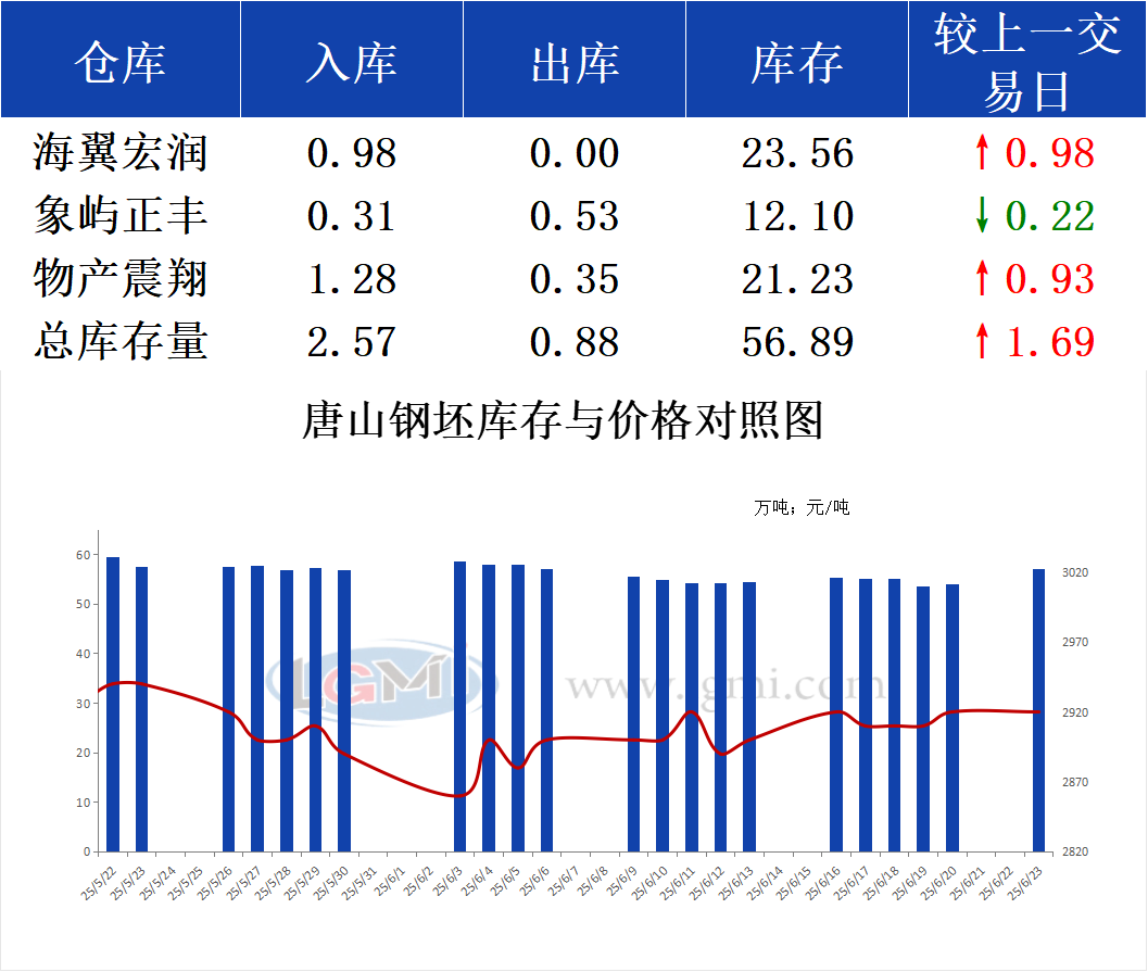 截至今晨,唐山地区样本仓库钢坯库存总量约56.89万吨,单日入库总量2.57万吨,出库总量0.88万吨。