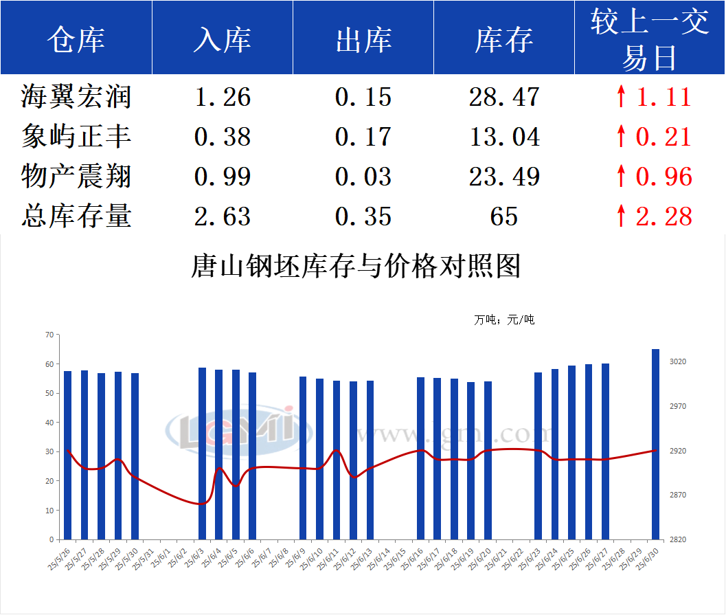 截至今晨,唐山地区样本仓库钢坯库存总量约65万吨,单日入库总量2.63万吨,出库总量0.35万吨。