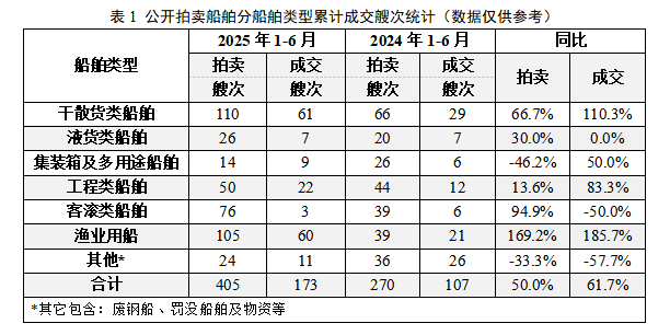 上半年,国内船舶拍卖市场延续回升态势,全国公开拍卖船舶423艘次,成交181艘次,同比分别增长57.2%和69.2%,总成交价约20亿元,同比增幅达62.3%。其中,司法拍卖表现尤为亮眼,成交139艘次、金额4.38亿元,同比激增247.5%和140.2%;商业拍卖虽成交量下滑,但因高价值船舶交易占比高,成交额达14.6亿元,同比增长42.1%。