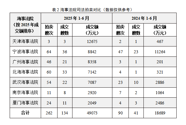 受国内经济转型影响,航运企业亏损面扩大导致司法处置船舶激增。加之今年上半年司法拍卖平台集中上架较多游船、客船,推高了司法拍卖船舶总量。上半年司法拍卖占比达总成交额的27.3%,较去年同期提升14.1个百分点,扭转连续四年萎缩态势。天津、宁波海事法院成交额居前,其中天津海事法院单笔成交1.27亿元。