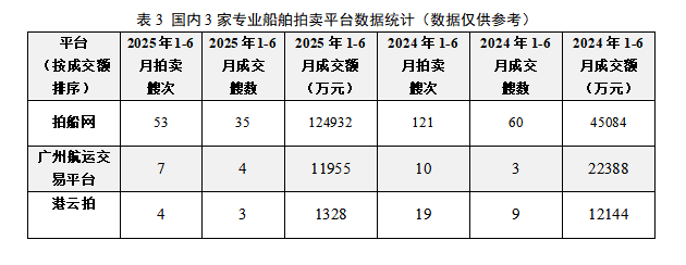 从主要平台表现看,国内三大船舶拍卖专业平台分化持续加剧。拍船网成交额13亿元,同比增长188.3%,占商业拍卖总额89%,保持领先地位;广州航运交易平台虽有多艘较大吨位的干散货船出售,但成交率有限,仅成交1.2亿元;而港云拍更是只成交4艘拖轮,成交金额仅为0.13亿元。