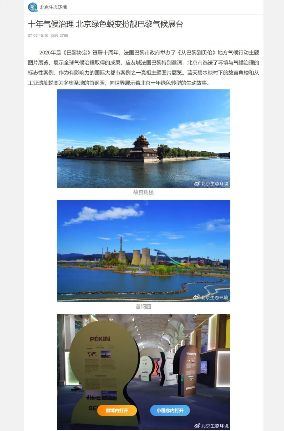 2025年是《巴黎协定》签署十周年,法国巴黎市政府举办了《从巴黎到贝伦》地方气候行动主题图片展览,展示全球气候治理取得的成果。应友城法国巴黎特别邀请,北京市选送了环境与气候治理的标志性案例,作为有影响力的国际大都市案例之一亮相主题图片展览。蓝天碧水映衬下的故宫角楼和从工业遗址蜕变为冬奥圣地的首钢园,向世界展示着北京十年绿色转型的生动故事。