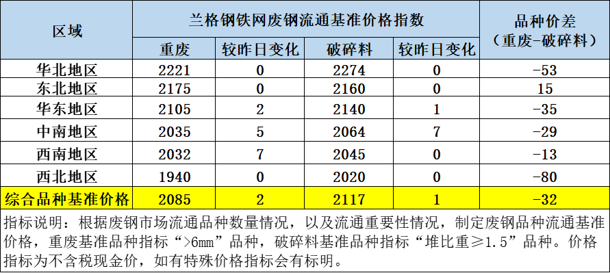 7月18日兰格钢铁网废钢流通基准价格指数为2101涨2:其中重废品种综合基准价格指数为2085涨2,破碎料品种综合基准价格指数为2117涨1。分区域华北地区重废2221(0)破碎料2274(0);东北地区重废2175(0)破碎料2160(0);华东地区重废2105(↑2)破碎料2140(↑1);中南地区重废2035(↑5)破碎料2064(↑7);西南地区重废2032(↑7)破碎料2045(0);西北地区重废1940(0)破碎料2020(0)。