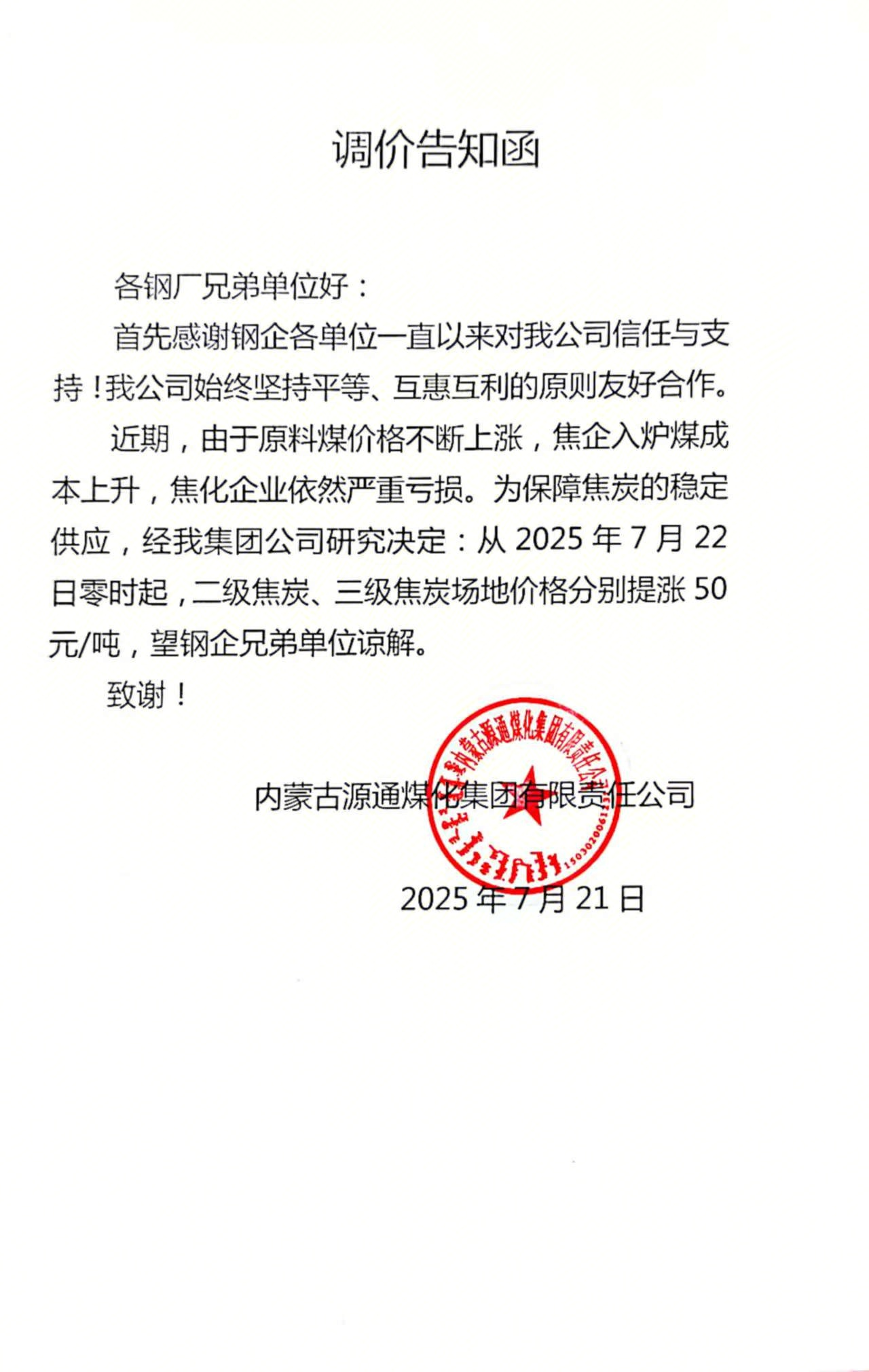 近期,由于原料煤价格不断上涨,焦企入炉煤成本上升,焦化企业依然严重亏损。为保障焦炭的稳定供应,经我集团公司研究决定:从2025年7月22日零时起,二级焦炭、三级焦炭场地价格分别提涨 50元/吨。