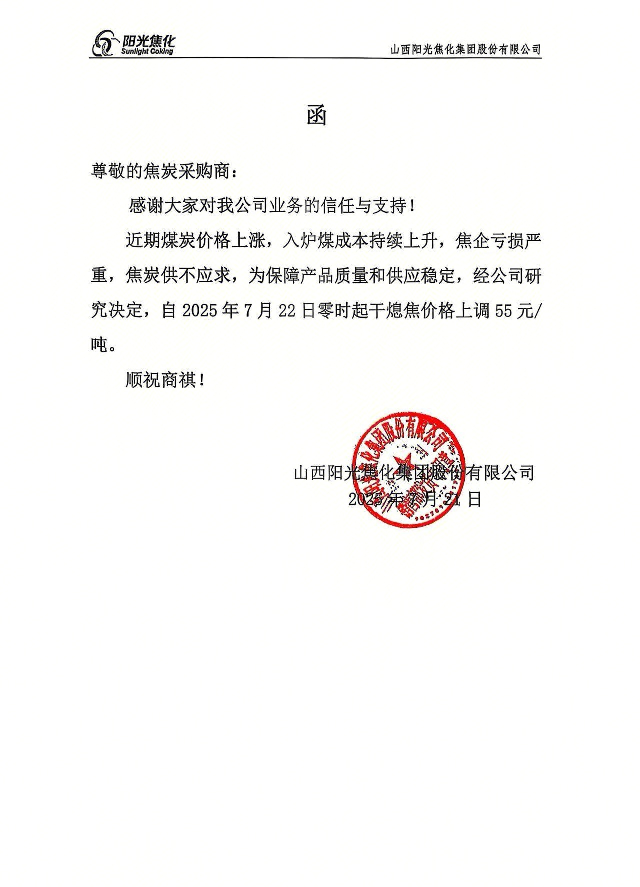 近期煤炭价格上涨,入炉煤成本持续上升,焦企亏损严重,焦炭供不应求,为保障产品质量和供应稳定,经公司研究决定,自 2025年7月22日零时起干熄焦价格上调55元/吨!