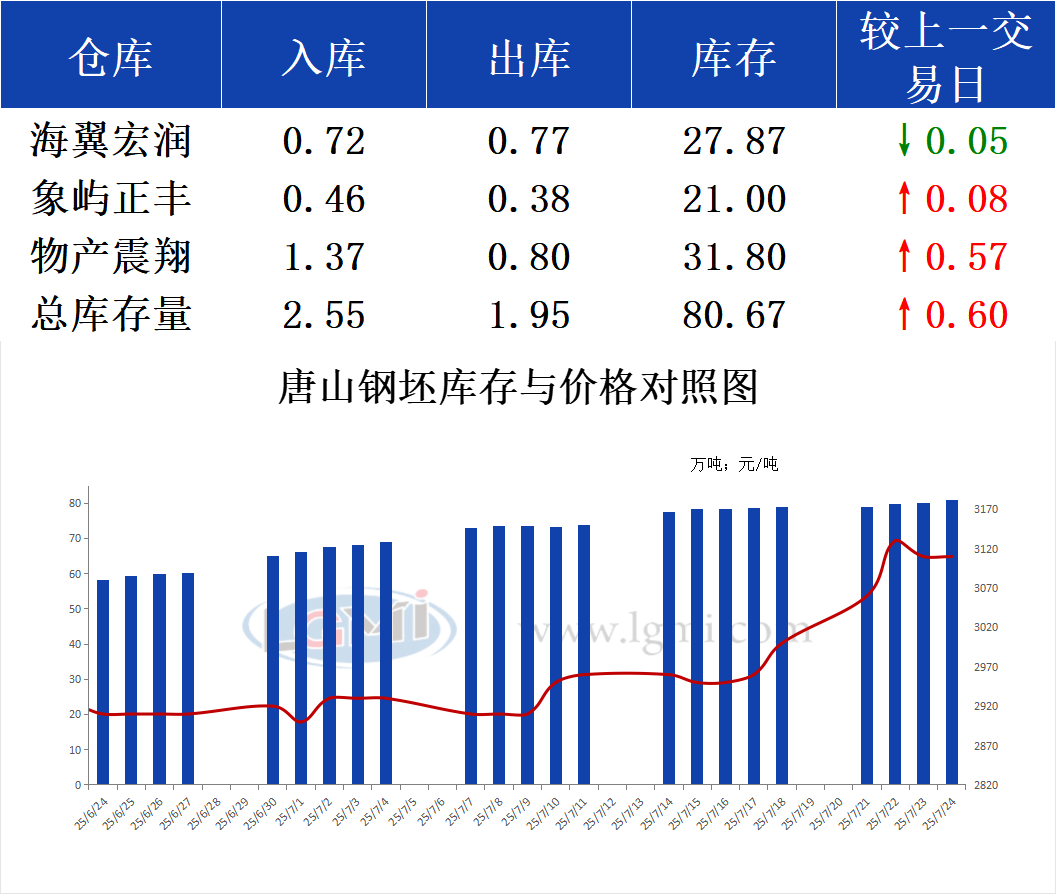 截至今晨,唐山地区样本仓库钢坯库存总量约80.67万吨,单日入库总量2.55万吨,出库总量1.95万吨。