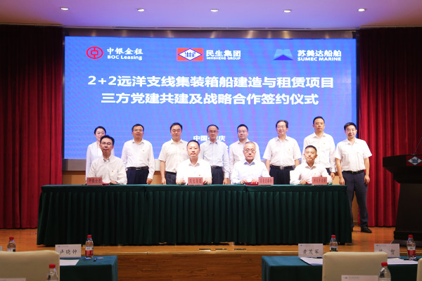 7月22日,中银金租与民生集团、江苏苏美达船舶举行“2+2艘1100TEU集装箱船新造船合同暨租赁合同签约仪式”。其中,中银金租作为项目船舶所有人和出资方,民生集团为船舶的长期租赁和经营管理方,苏美达承建船舶,形成航运产业发展的增益效应,旨在为民生集团远洋船队更新提供定制化服务。