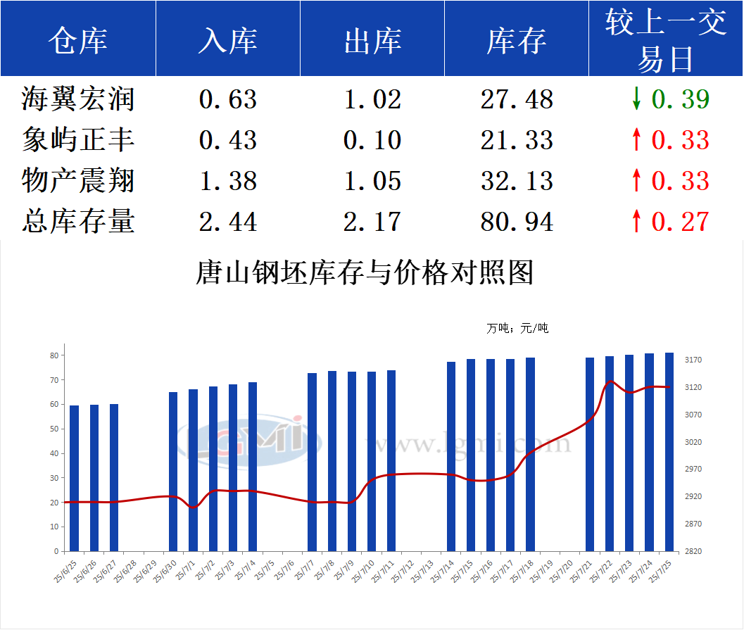 截至今晨,唐山地区样本仓库钢坯库存总量约80.94万吨,单日入库总量2.44万吨,出库总量2.17万吨。