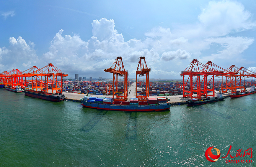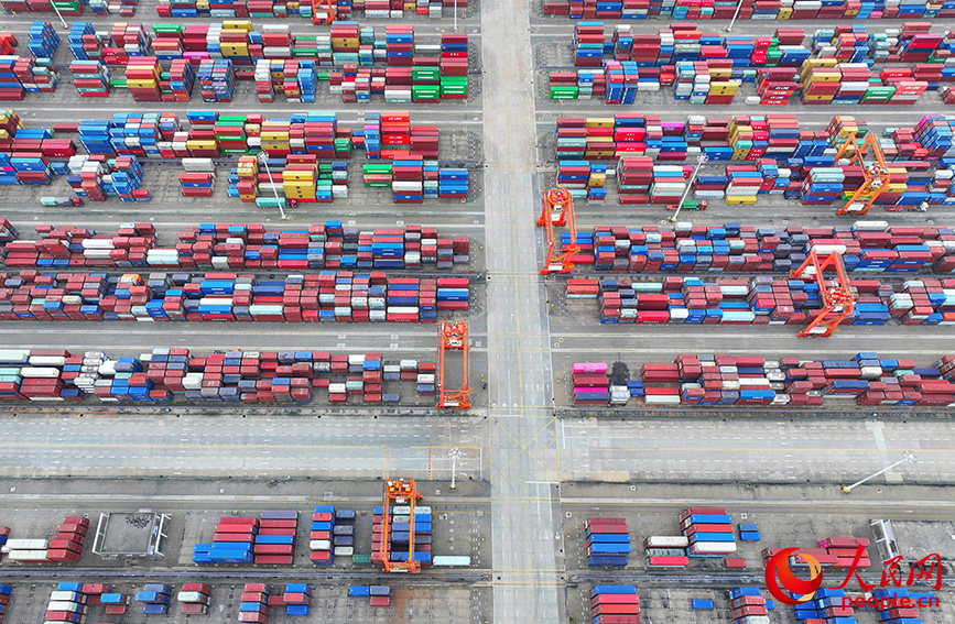 成千上万个集装箱像积木一样整齐摆放在码头。人民网 付华周摄