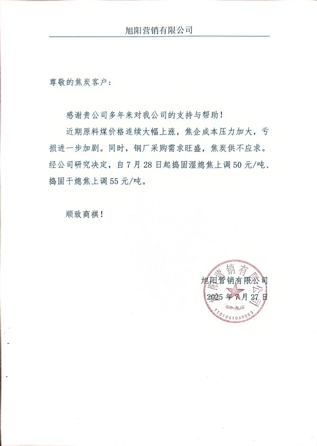 - 快讯:7月27日旭阳营销有限公司焦炭价格上调50-55元/吨2025/7/28